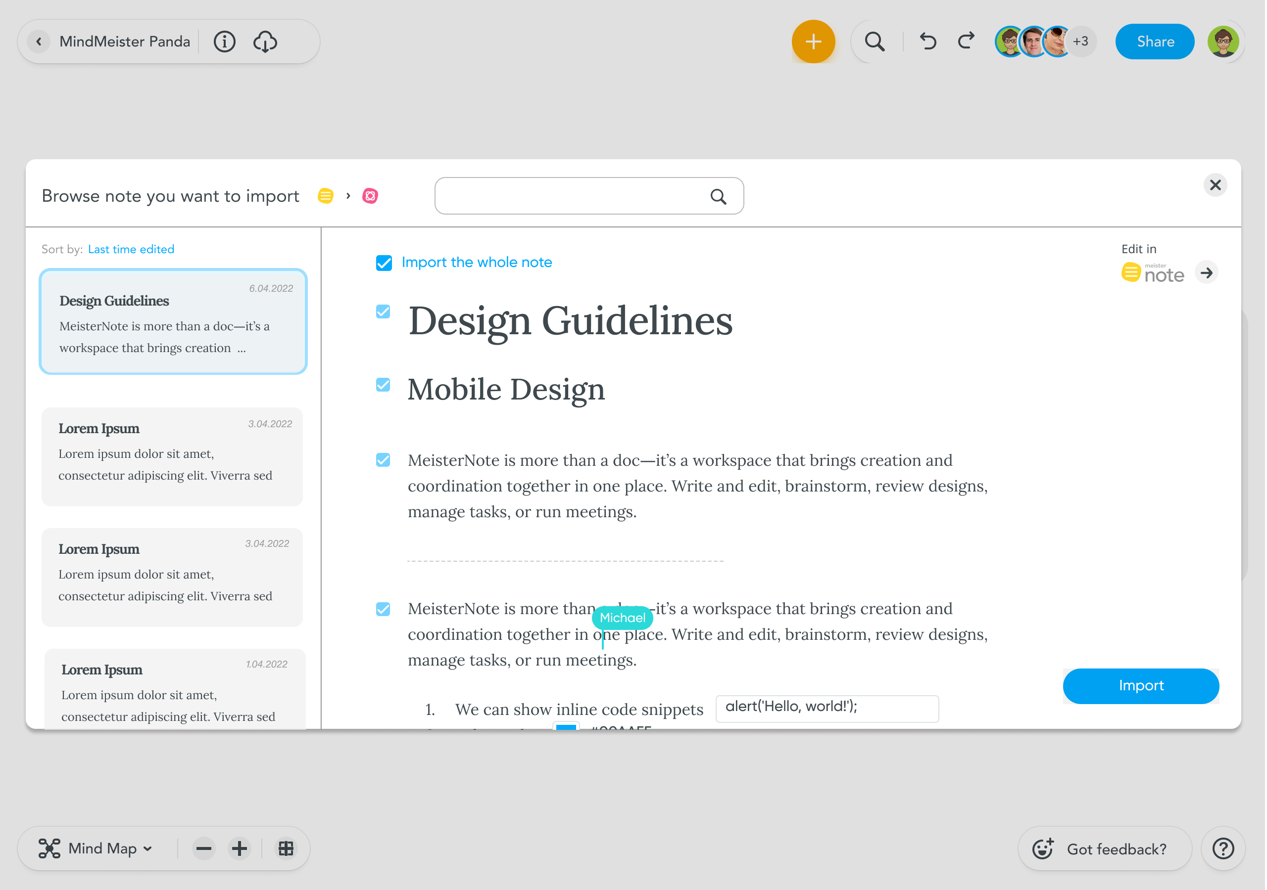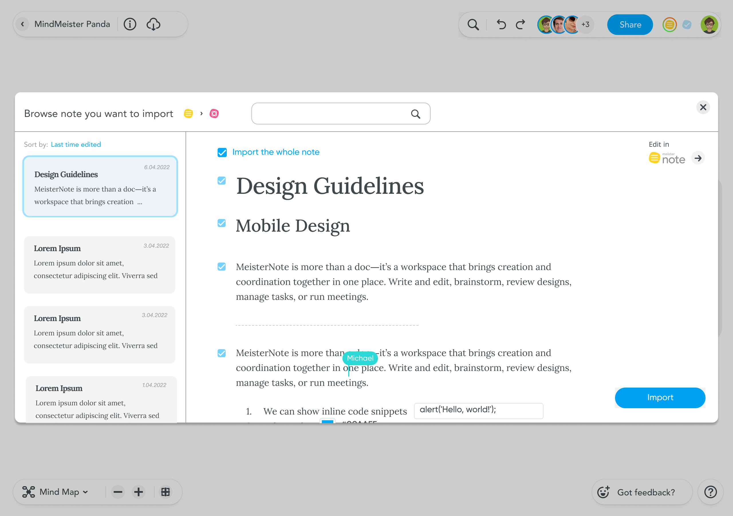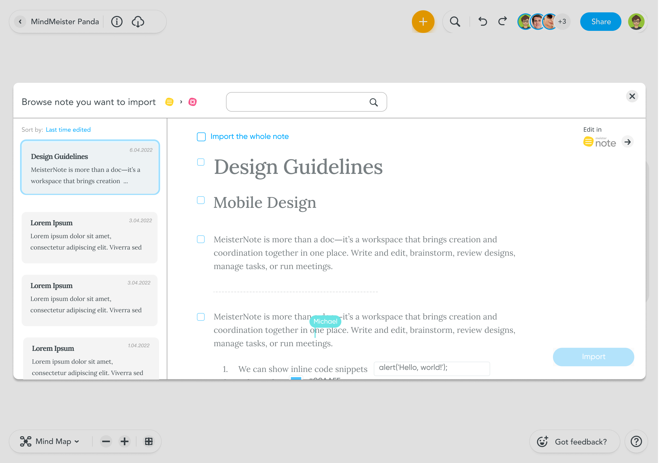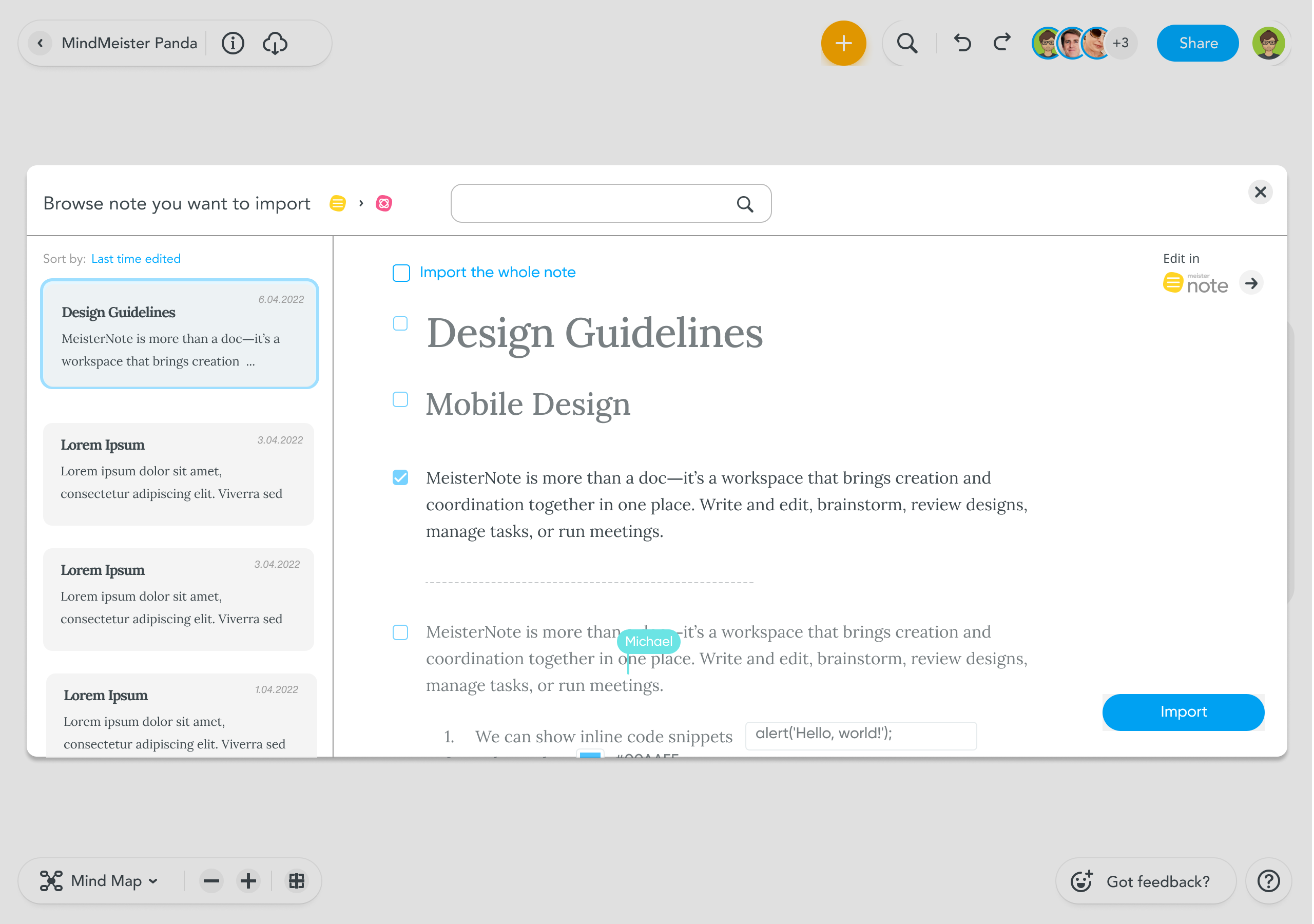 Below I present two proposals for integrating the Meister package services. My solutions are based on the assumption that the core service of Meister Suite is Meister Mind. I understand the integration of services as an easy flow of information between the services of the Meister package. In the attached high-fidelity wireframes, I present my ideas for the flow of information and its exposure on the websites.