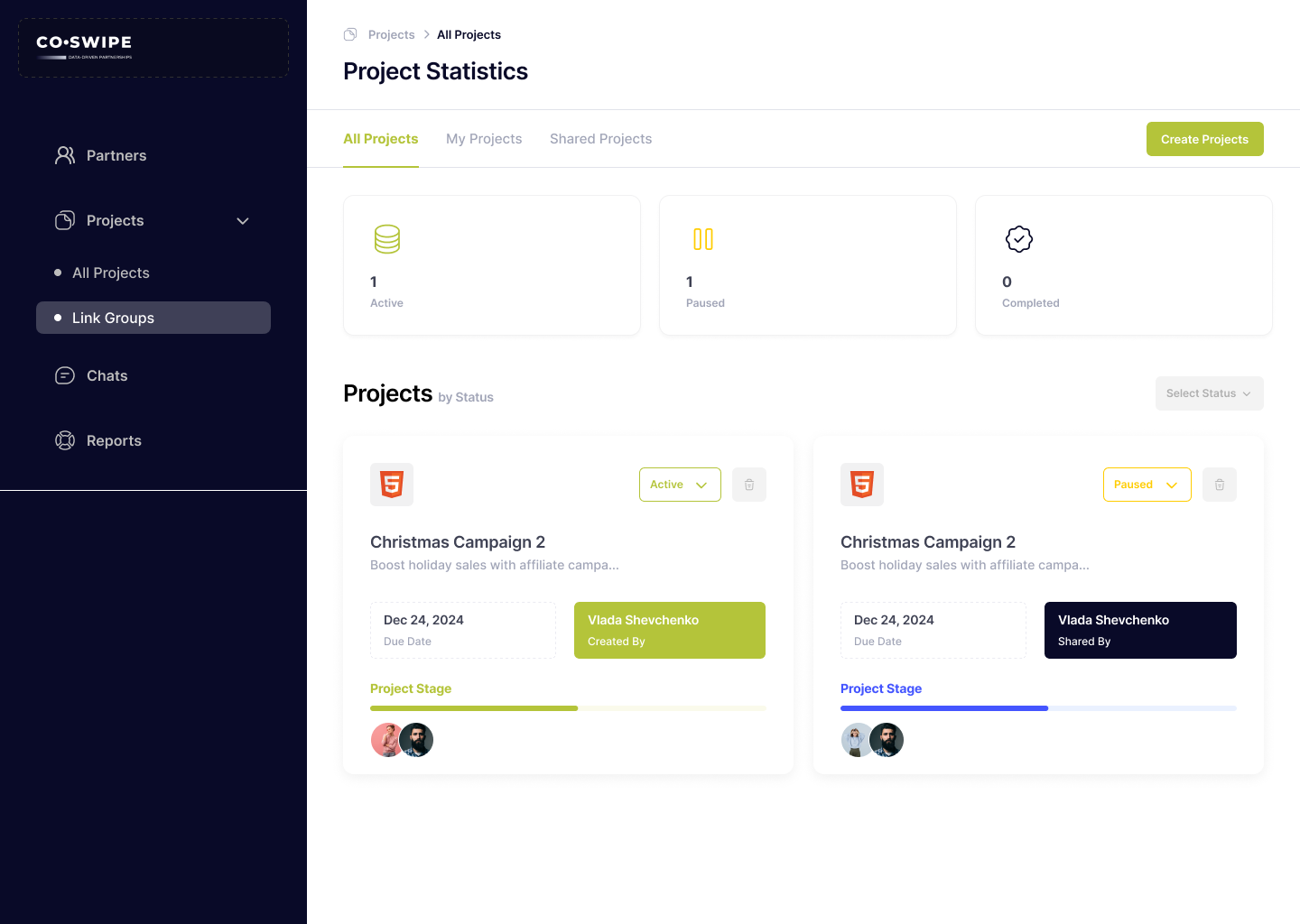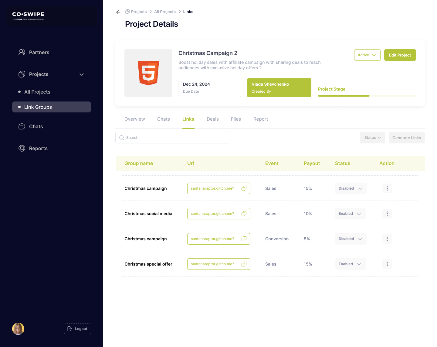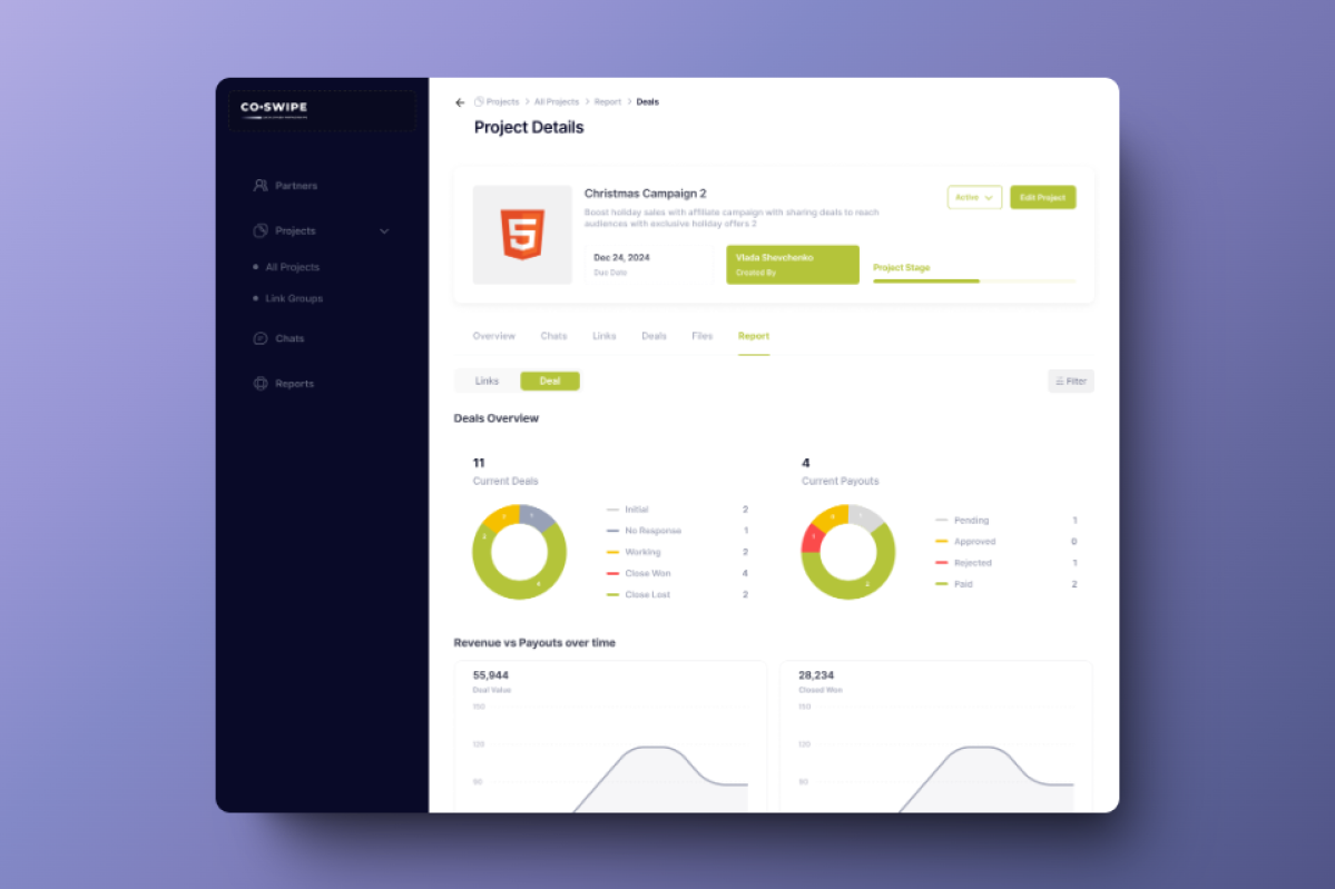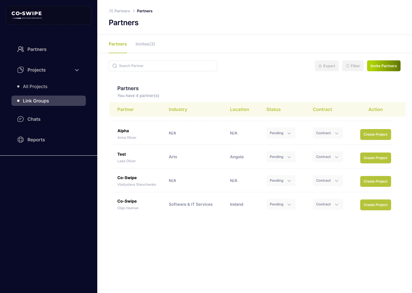 The objective of this project was to design a user-friendly interface for the Partners screen of Co-Swipe, a platform facilitating business collaboration through affiliate marketing, co-marketing, and strategic partnerships. The screen was intended to allow users to manage and monitor partner relationships, track collaboration status, and efficiently create new projects. The design aimed to provide a simple and intuitive way to view key partner details, update their status, and filter them by criteria like industry and location. It also focused on improving usability for project managers and marketing teams, allowing for quick actions such as inviting new partners or starting projects.