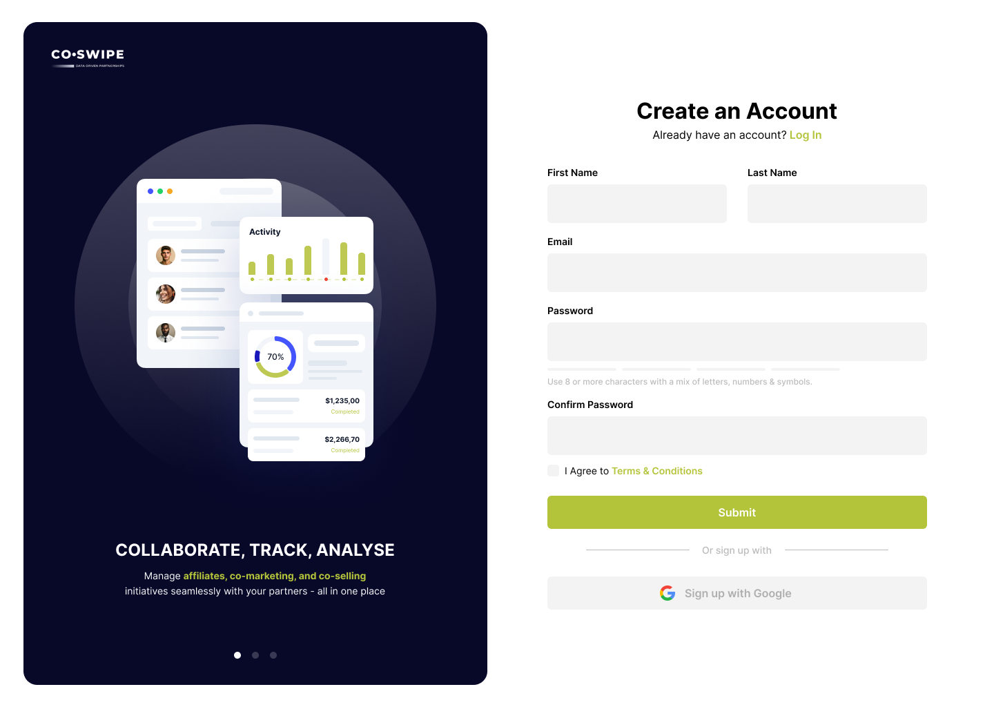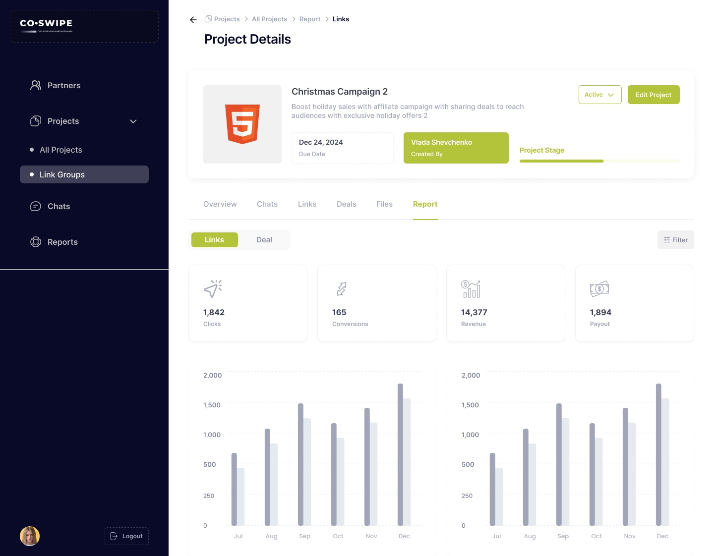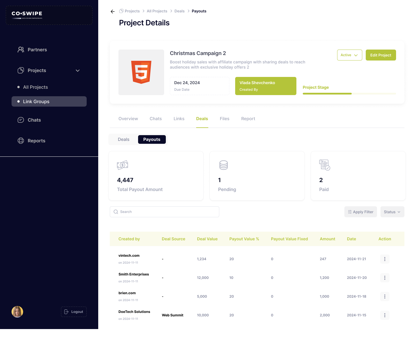 The objective of this project was to design a user-friendly interface for the Partners screen of Co-Swipe, a platform facilitating business collaboration through affiliate marketing, co-marketing, and strategic partnerships. The screen was intended to allow users to manage and monitor partner relationships, track collaboration status, and efficiently create new projects. The design aimed to provide a simple and intuitive way to view key partner details, update their status, and filter them by criteria like industry and location. It also focused on improving usability for project managers and marketing teams, allowing for quick actions such as inviting new partners or starting projects.