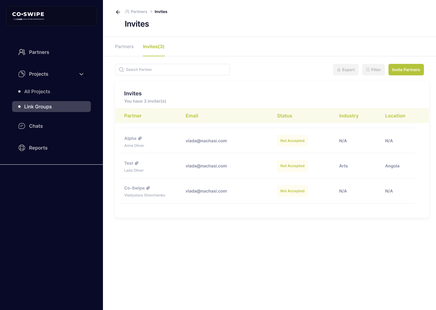 I designed this panel to manage partner invitations easily. It shows a list of invited partners with their status (e.g., "Not Accepted"), allowing users to track which invitations have been accepted. Each partner's details, like name, email, industry, and location, are displayed clearly. Users can filter the list, export it, or send new invites with simple buttons. The navigation on the left leads to other sections like Projects, Chats, and Reports, making this part of a larger partner management system. The goal is to help companies manage partner relationships and track invitation statuses efficiently