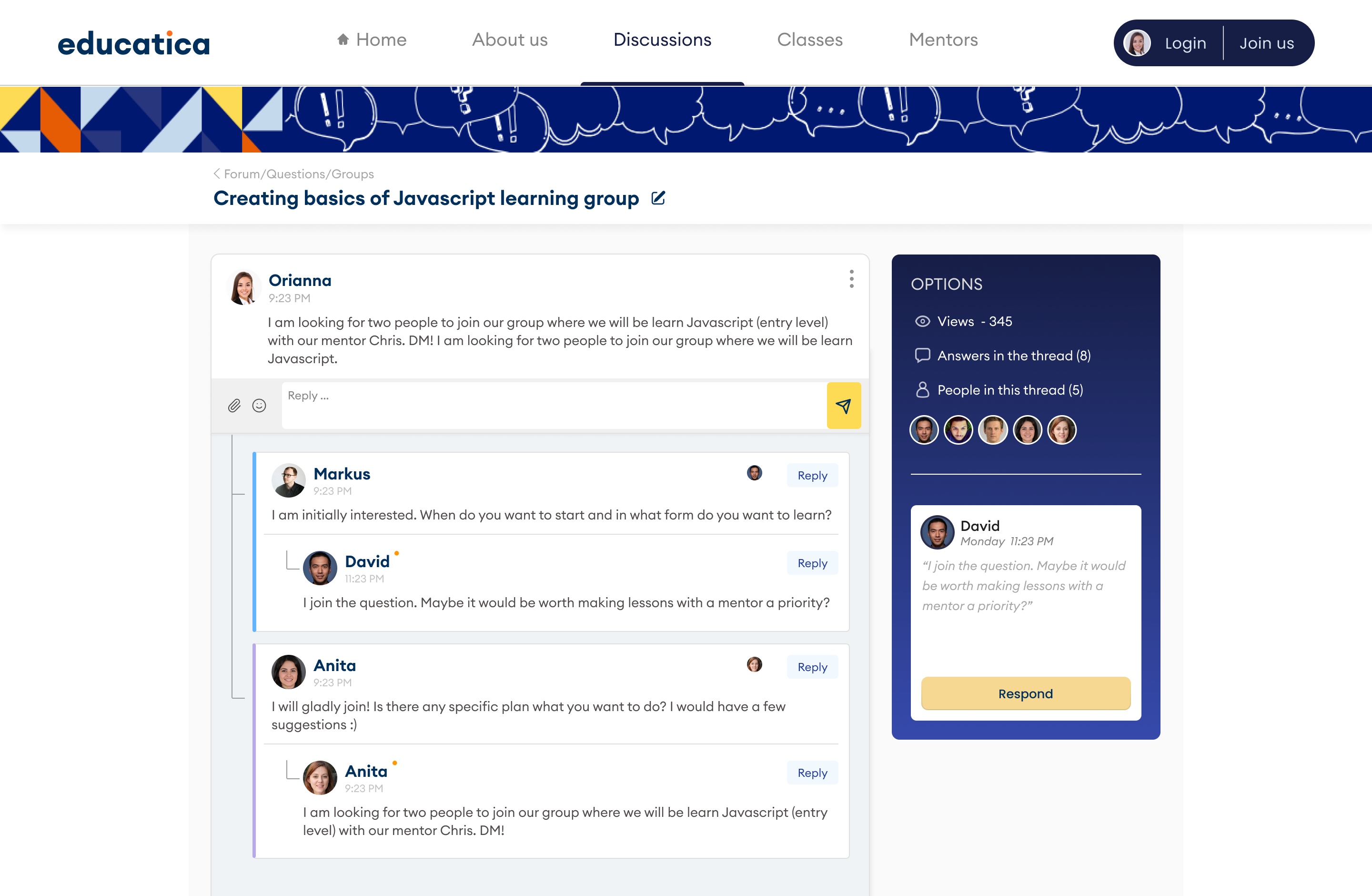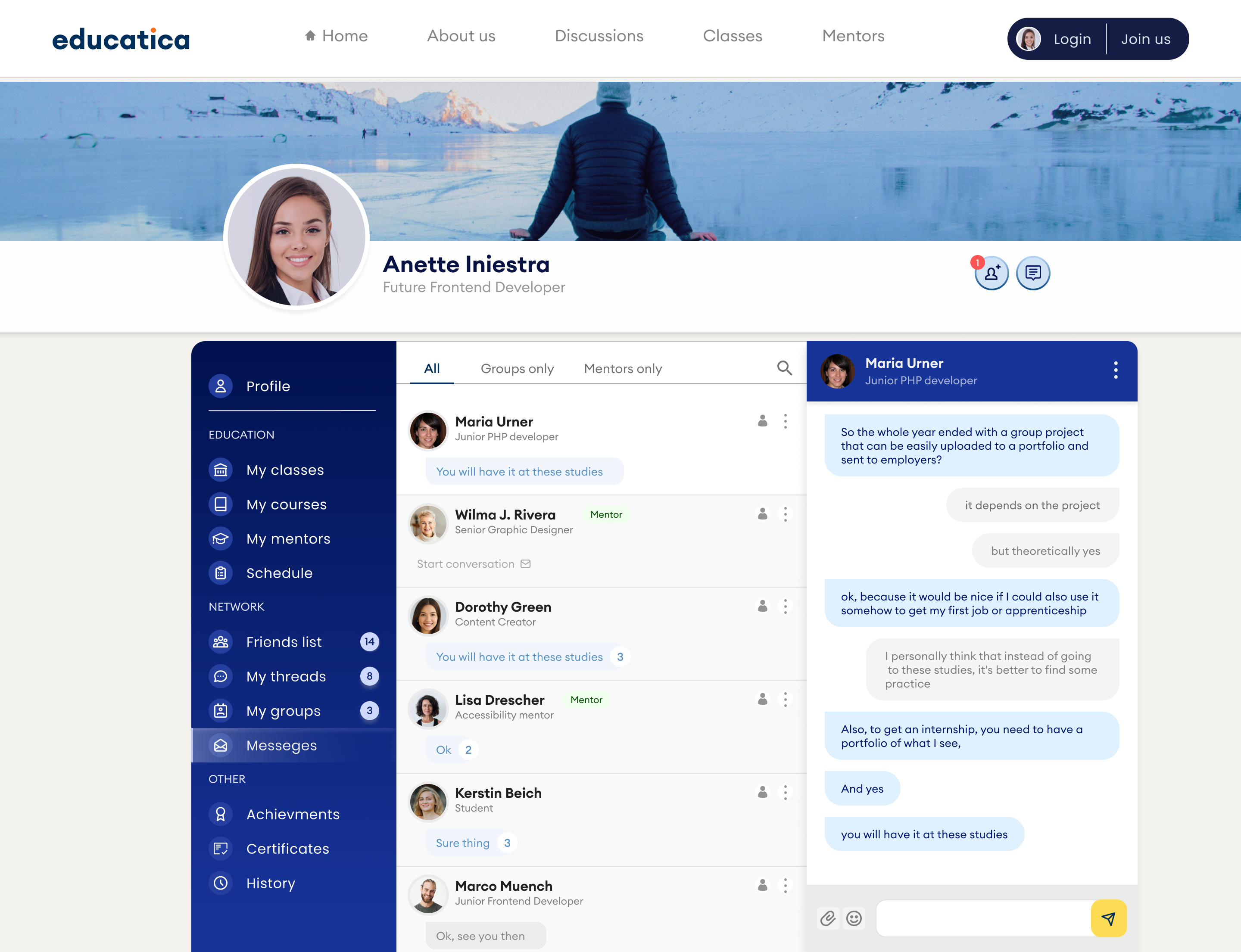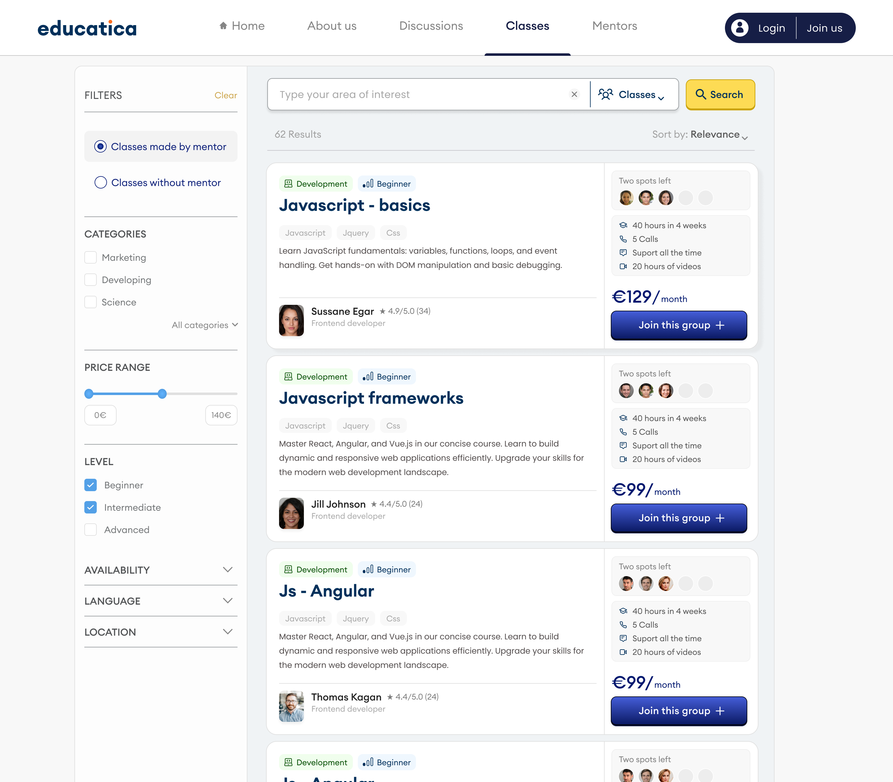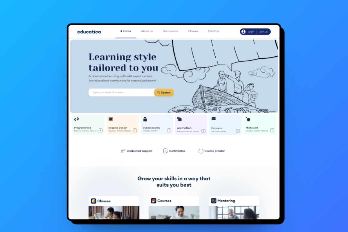 The portal's main goal is to build a community of eager-to-learn users and mentors. One of the unique features of the portal will be the ability to create educational groups. Groups of no more than five people will be formed to bring together individuals with similar levels of advancement in a particular field. Groups can be created both bottom-up by users and top-down by mentors. The goal of the groups is to increase participant involvement while also lowering the cost of mentoring services. By default, the cost of mentoring will be distributed among group members and will be lower than it would be during typical 1-on-1 mentoring. Creating and participating in a class/group is free, but mentoring is paid if the group chooses to use it. If a user prefers to learn on their own, they can access all paid and free materials created by mentors, as well as mentoring services, through the website.