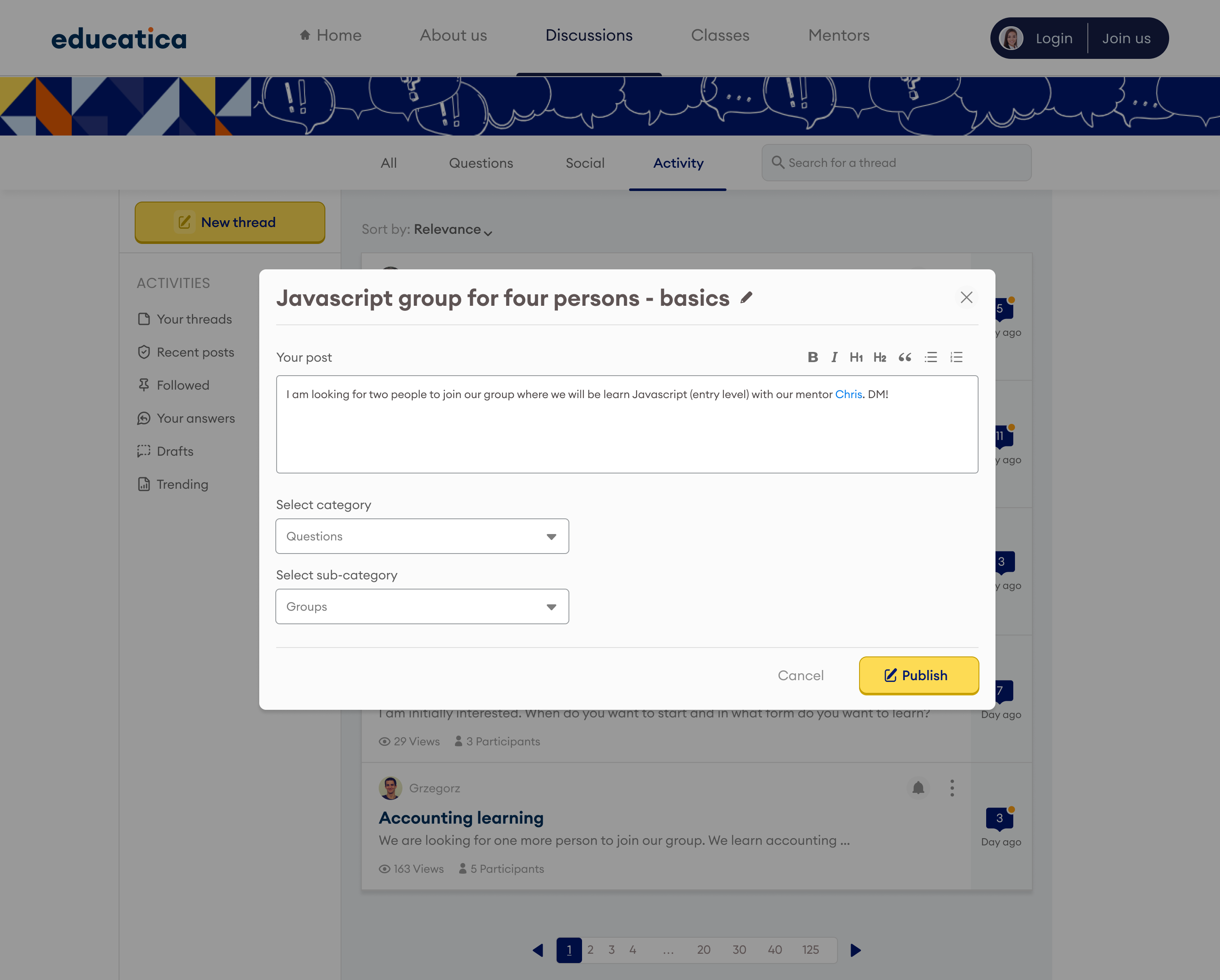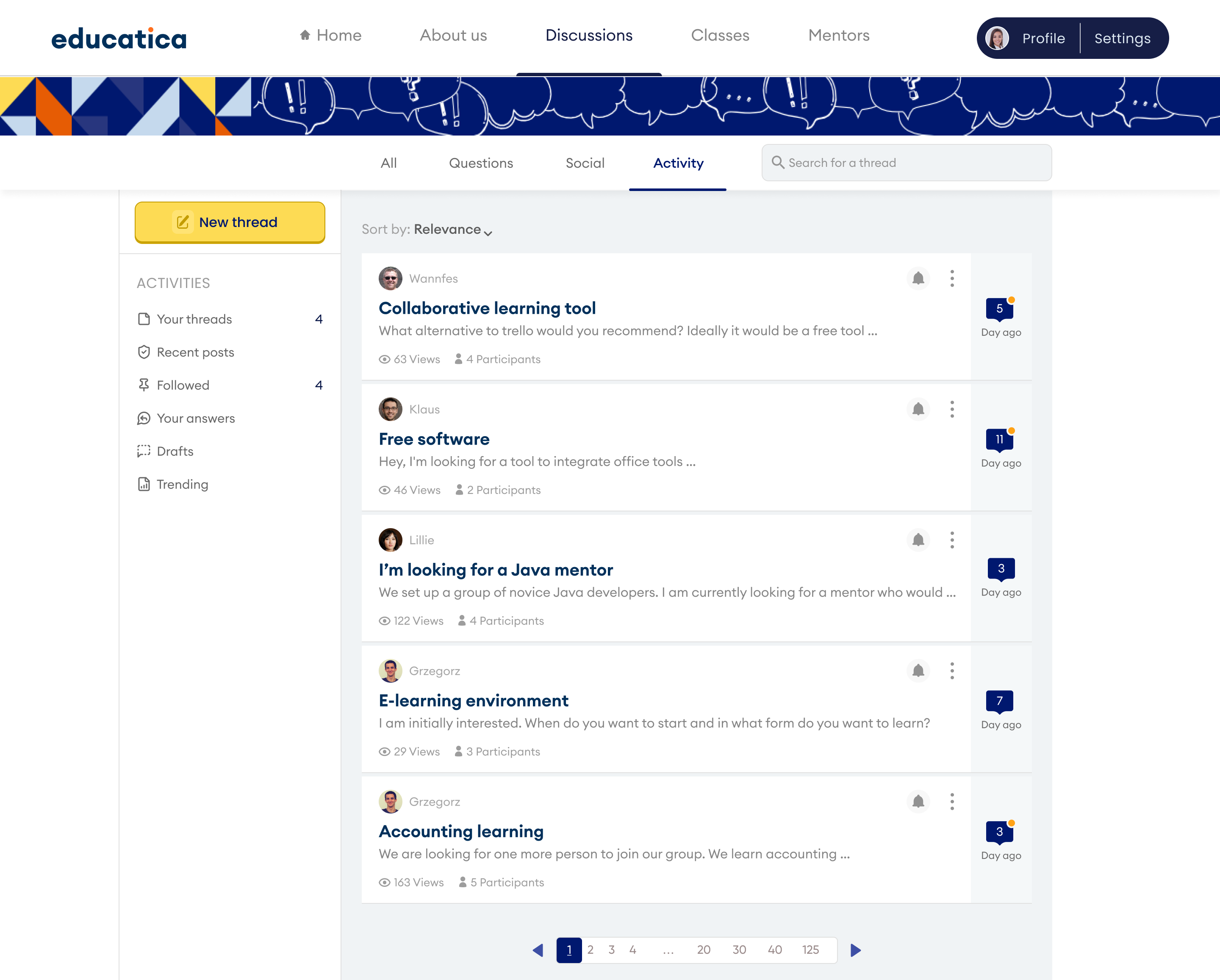 A thread can be started directly on the discussion forum, which can be accessed via the global navigation, or from the user's dashboard, via the "My Threads" tab. There, the user can also track his threads and threads that he has marked as watched collectively.