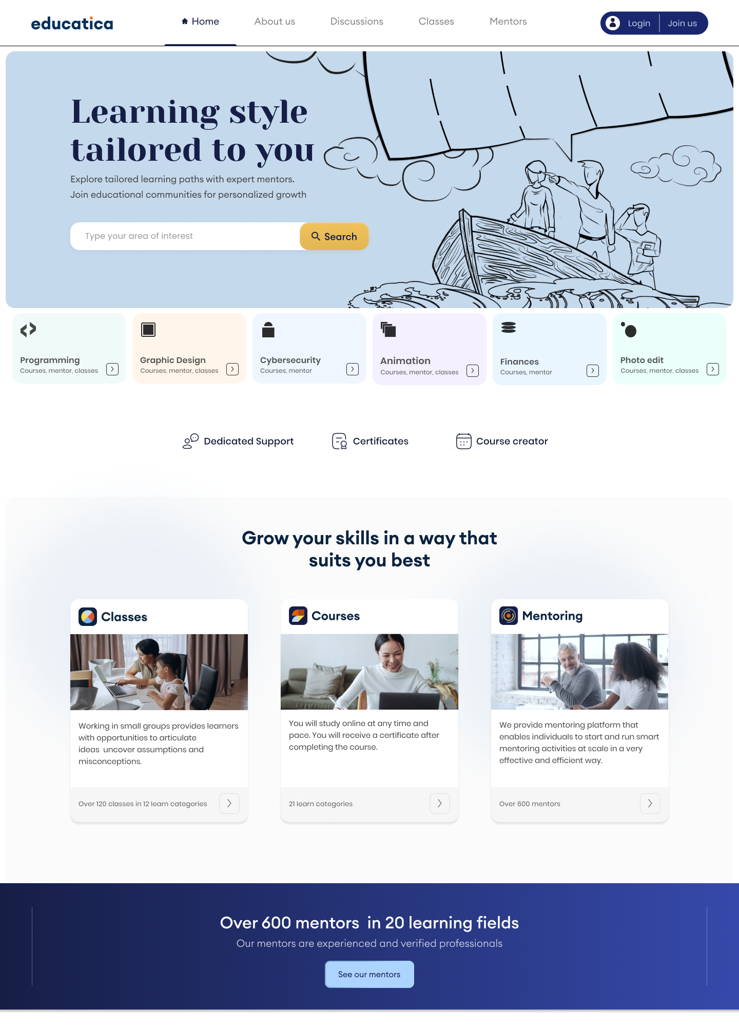 The landing page design incorporates all of the standard website elements, with a strong emphasis on verifying mentors and providing access to searching for educational paths in two ways (search engine and tab in global navigation).