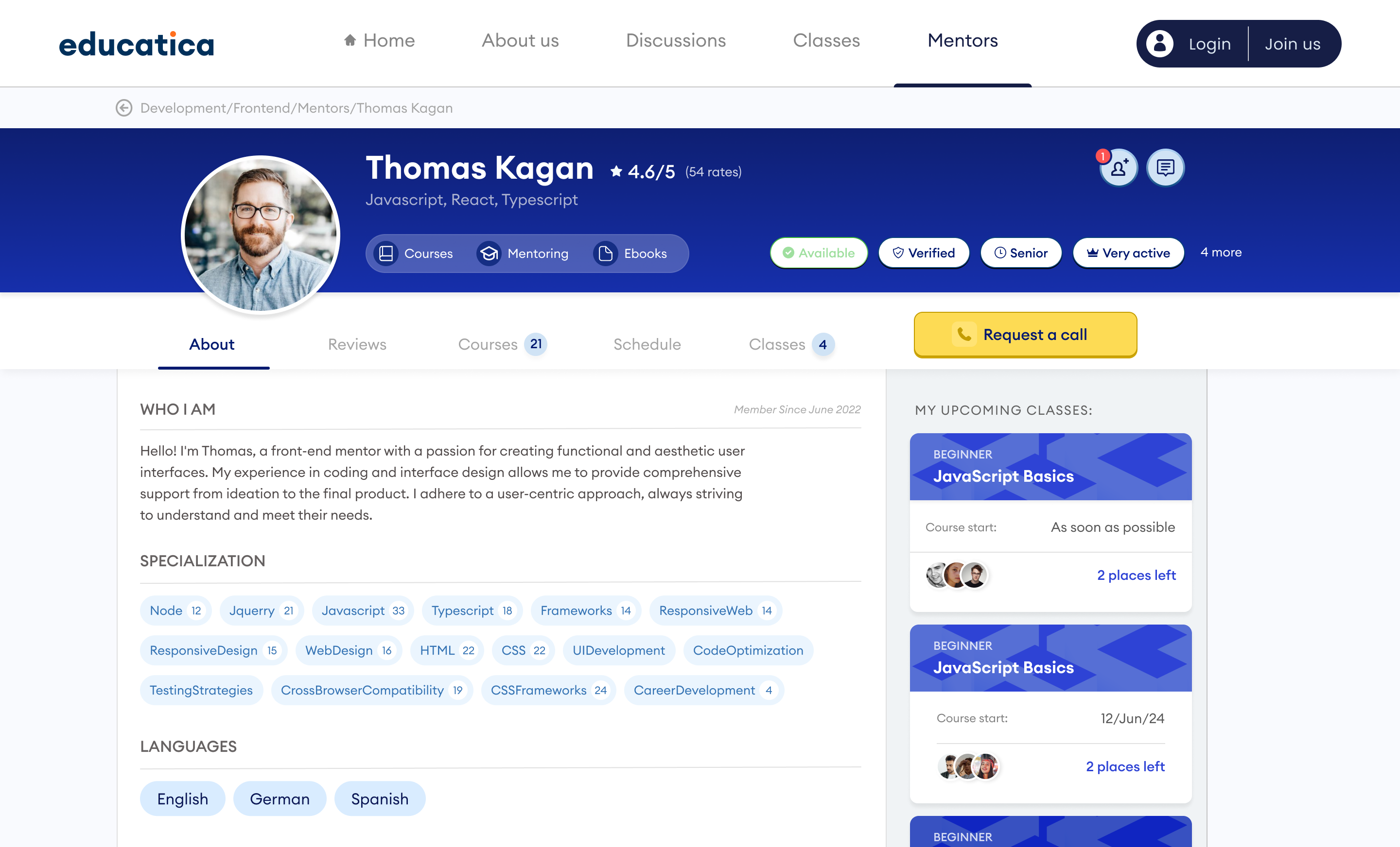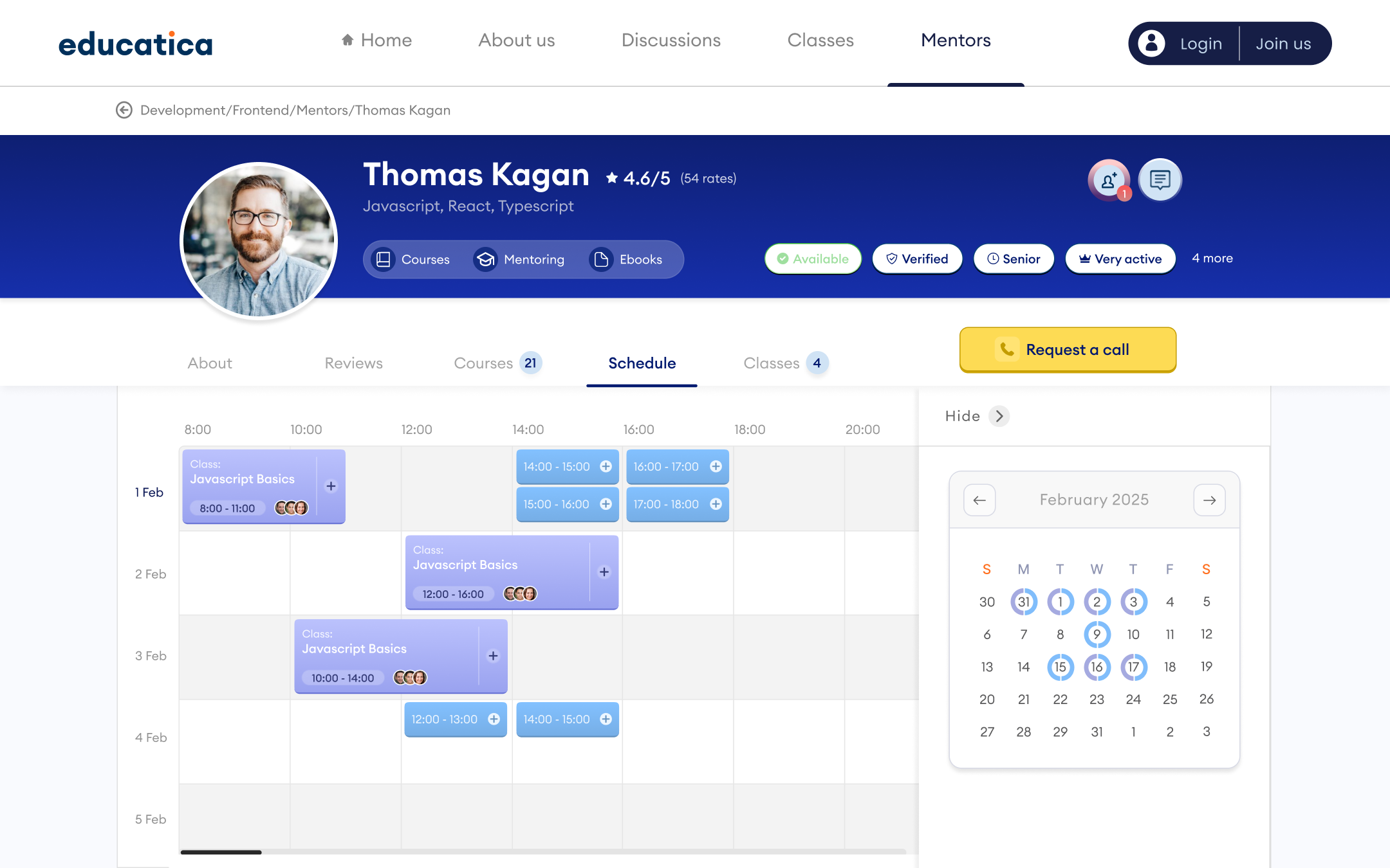 Mentor profiles include valuable information about the mentor along with course offerings and his schedule, including free slots for consultations. The mentor's badges, which inform the user about the mentor's activity, involvement, and opinions about him, are an important element of the design.