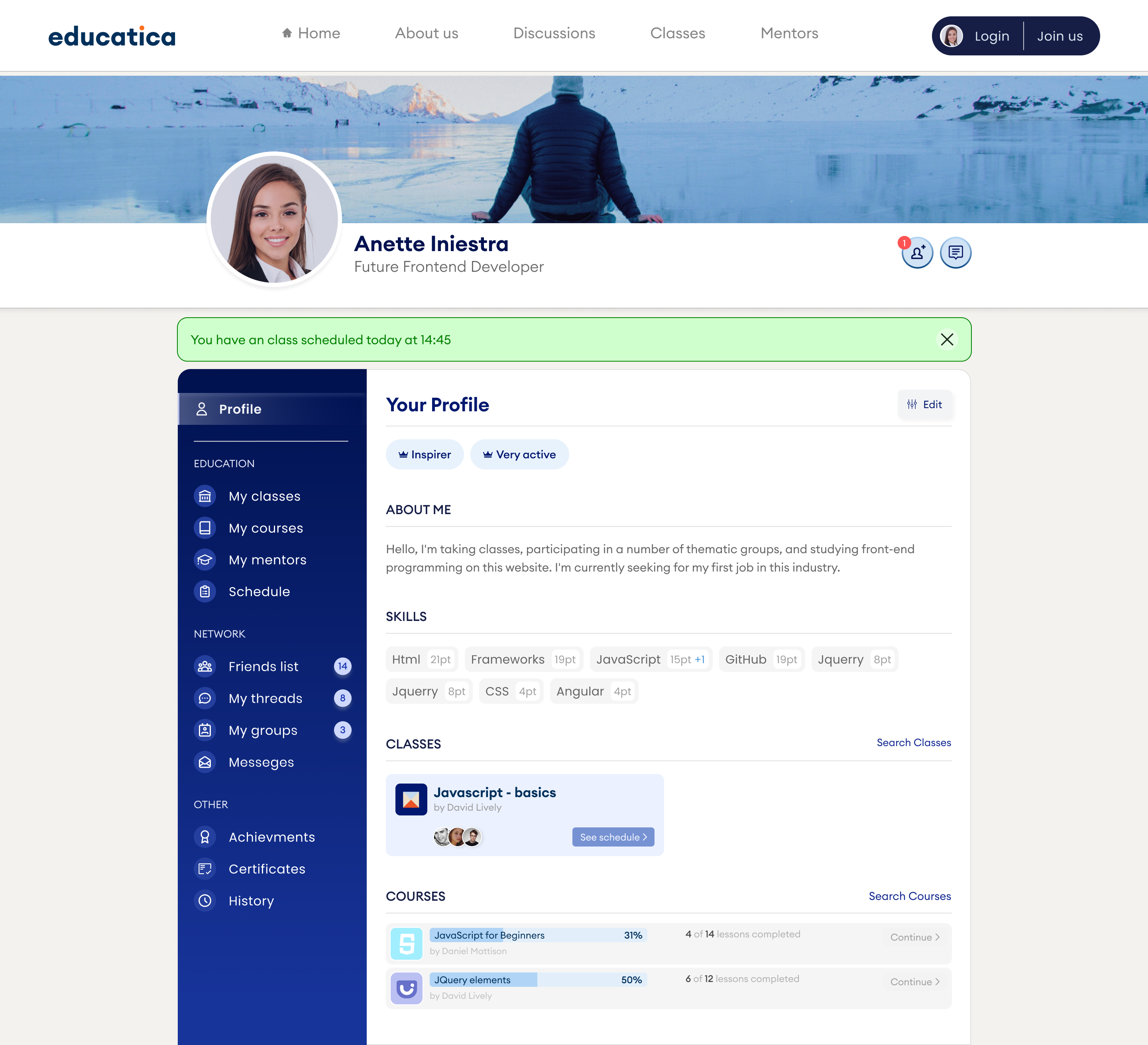 The user receives a dashboard, which serves as a platform for contacting other users, mentors, saving courses and classes, viewing statistics, planning activities, and so on.