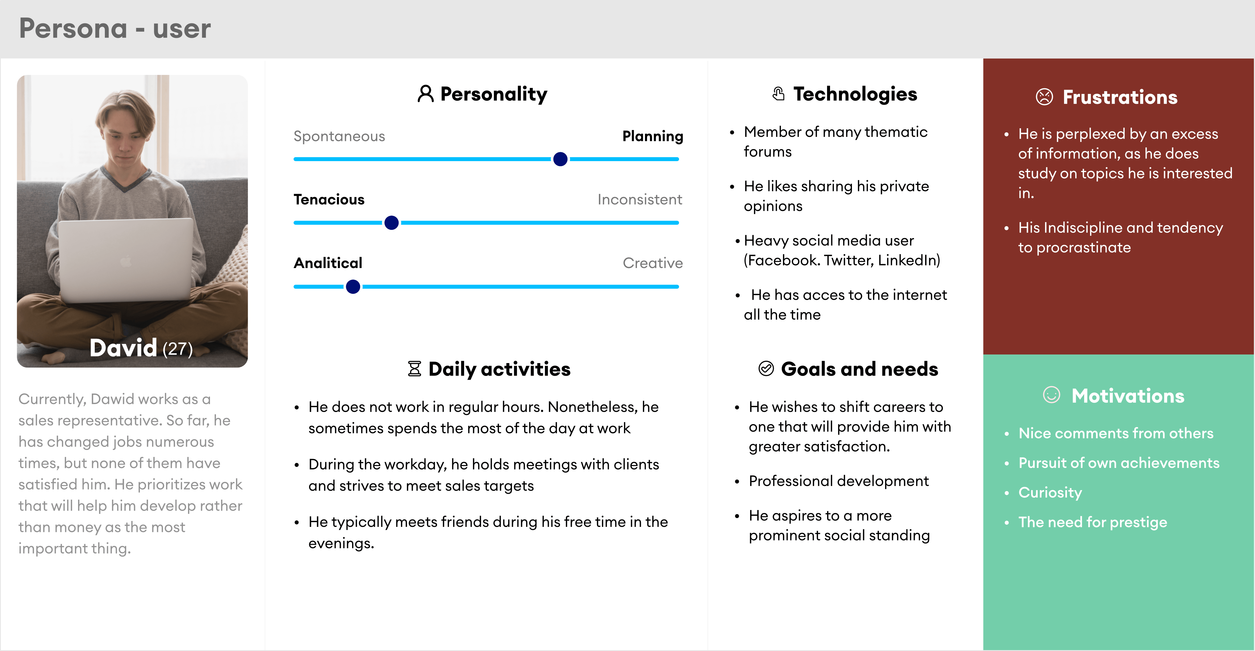 Two personas were created based on the research outcome, and they served as a way of visualizing the user's problems and pains. Personas provide the most useful information about their frustrations and motivations. Second, their objectives and the technologies they employ are critical. All our respondents indicated that they use platforms such as Facebook, linkedin, etc. and YouTube is the main source of knowledge for them. The extensive use of social media allows us to identify patterns in user behavior.