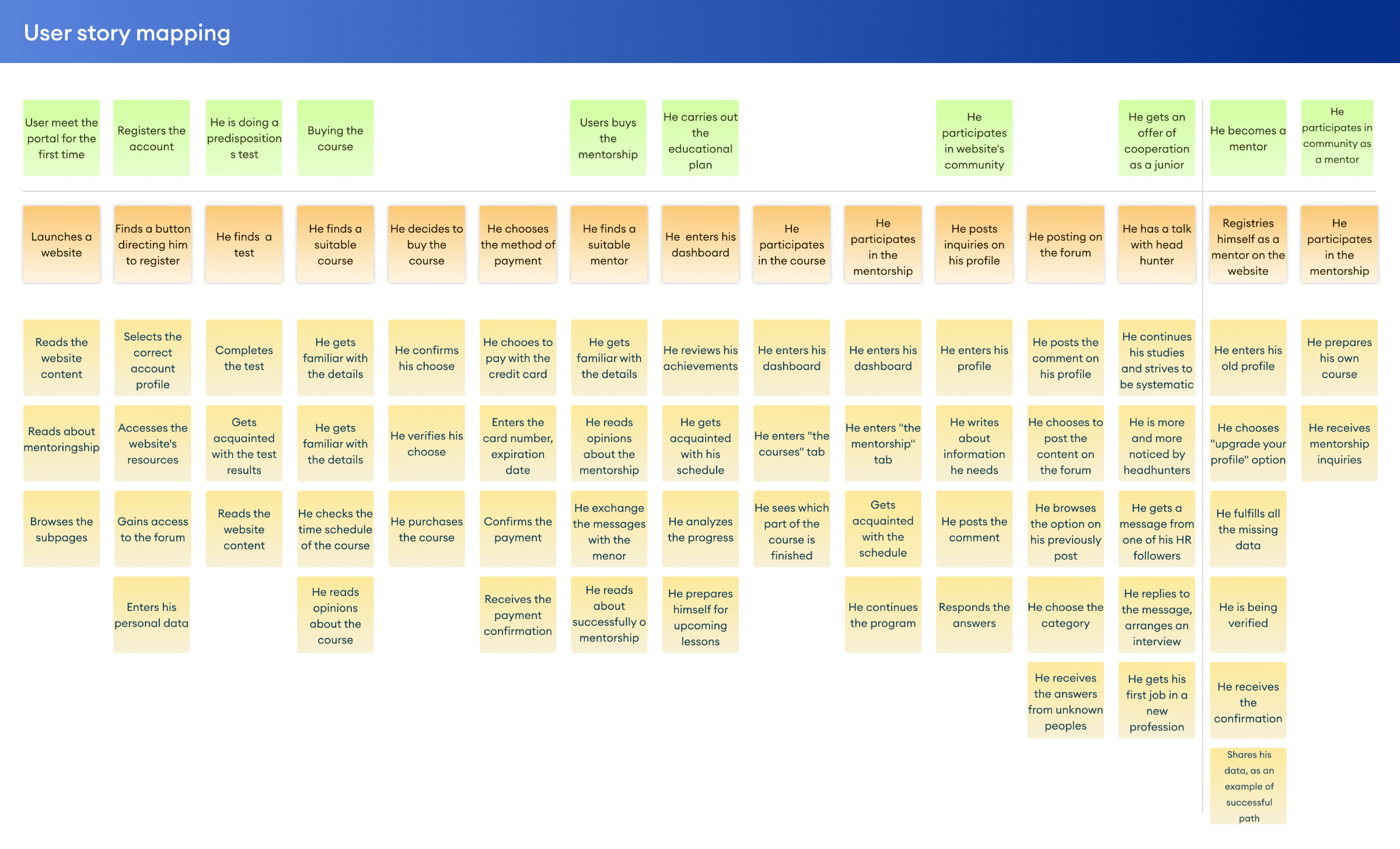 To delve a bit deeper into details, organize information, and outline functionalities, the number of steps, etc., I've created a User Story Mapping focusing on the steps in the main user path. The subsequent stages of the project revolve around this main path.