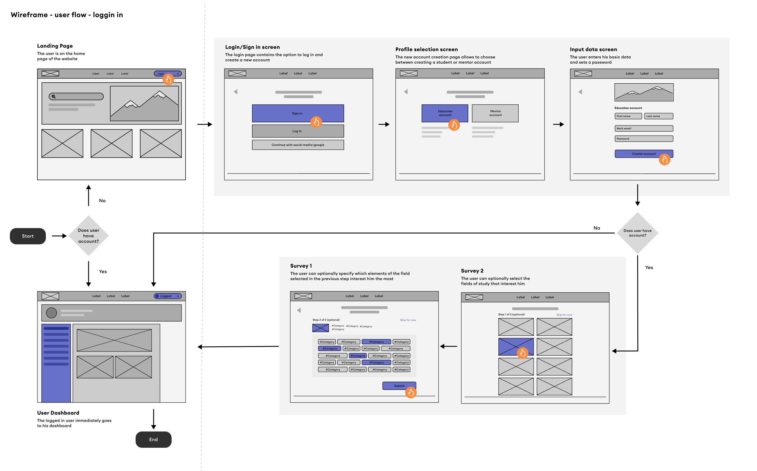 WIREFLOW NO.1:The user enters the website and learns about its possibilities by reading the content on the landing page. He clicks the "create account" button, and he is routed to a profile creation window. He sees three account creation options, clicks the button that allows him to create an account for the individual who wants to study. He inputs his information, selects a password, and verifies it. The user is taken to a screen where he is asked whether he wants to take a test that will determine his educational path. After creating an account, the user is directed to the user's dashboard.