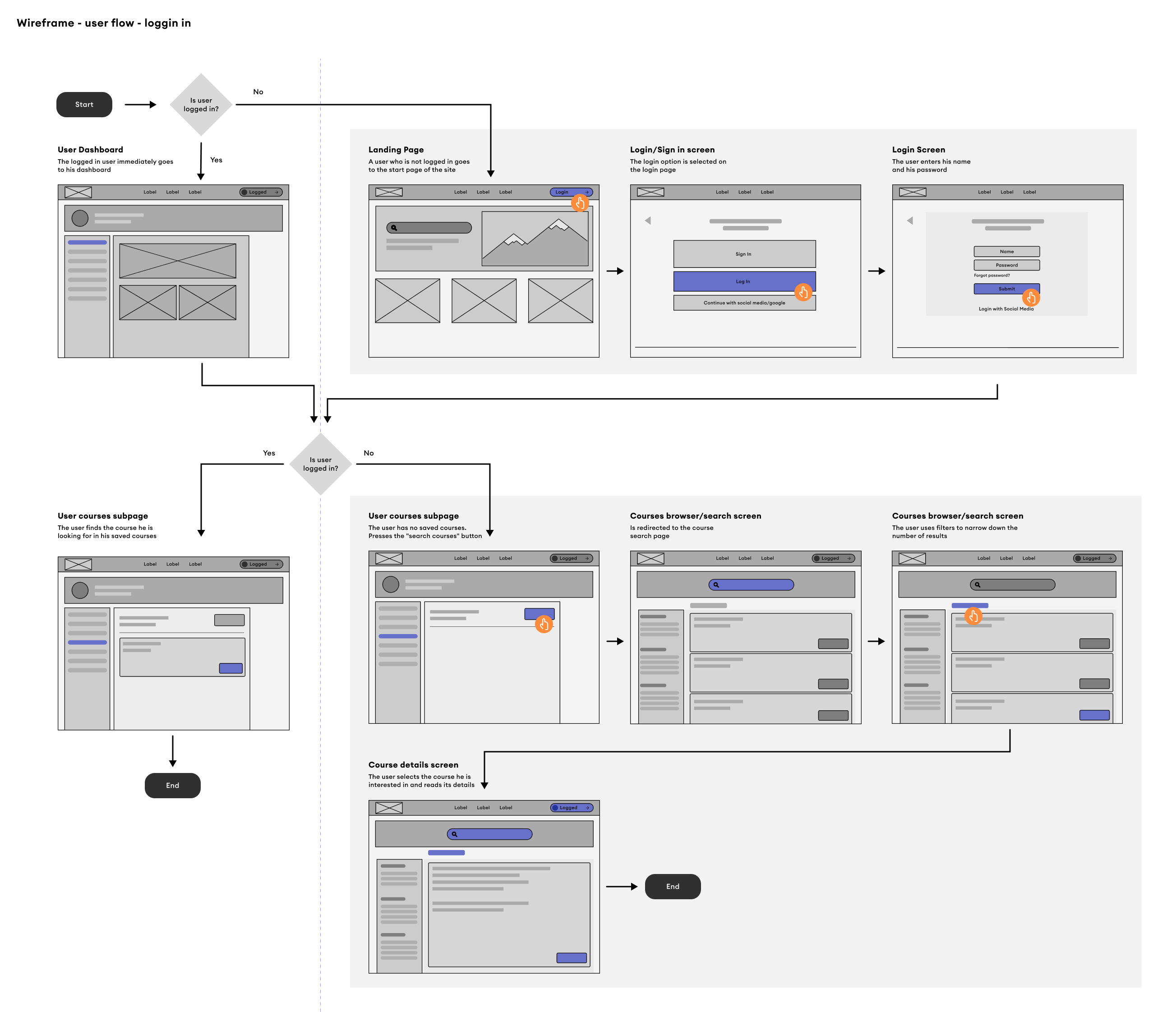 WIREFLOW NO.2: The user navigates to the website and logs in with his username and password. It is forwarded to the user dashboard. The user navigates to the "my courses" tab. If no courses have been purchased, he clicks the "search courses" button, which takes him to the course finder. He types in the phrase he's looking for, finds the best course, and makes a purchase.