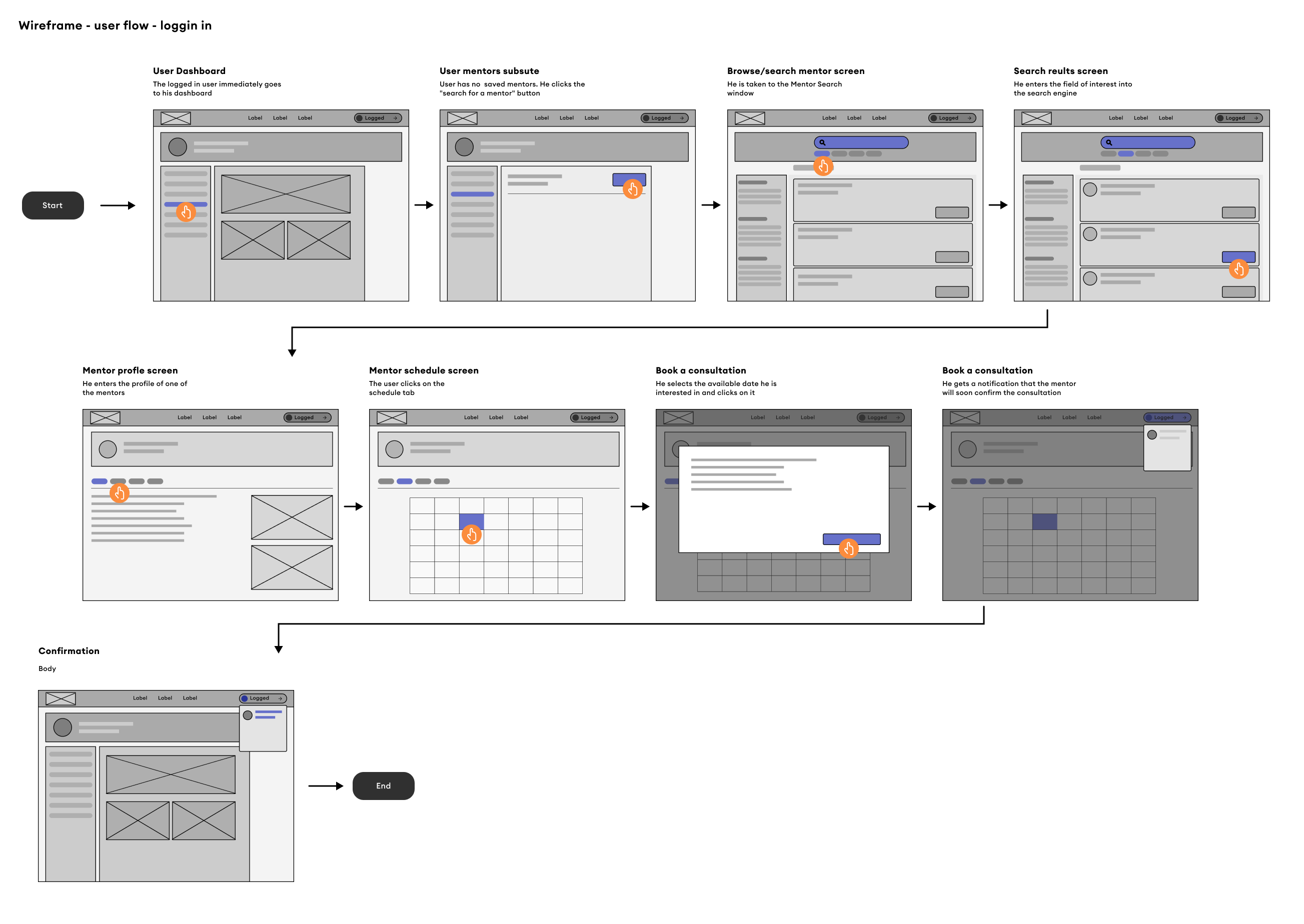 WIREFLOW NO.3: The user navigates to his dashboard. When he clicks the'my mentors' tab, he is taken to the mentors search engine. He searches for the phrase he's looking for, finds the mentor, and fills out his profile. On the mentor's profile, he selects the'schedule' tab and searches for a free consultation date. He finds the right date and makes a reservation. After a while, he receives a confirmation of the consultation date from the mentor.